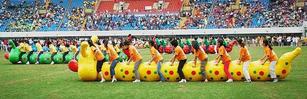 項(xiàng)目描述:該項(xiàng)目一般分組進(jìn)行,各組隊(duì)員用一只拴著許多繩子的鼓去接彈在空中的排球。每隊(duì)學(xué)員,在規(guī)定時(shí)間內(nèi),盡可能多的完成任務(wù)。這是一個(gè)要求團(tuán)隊(duì)高度協(xié)作的項(xiàng)目,要求隊(duì)員在保證安全的情況下,創(chuàng)造盡可能多的顛球記錄。